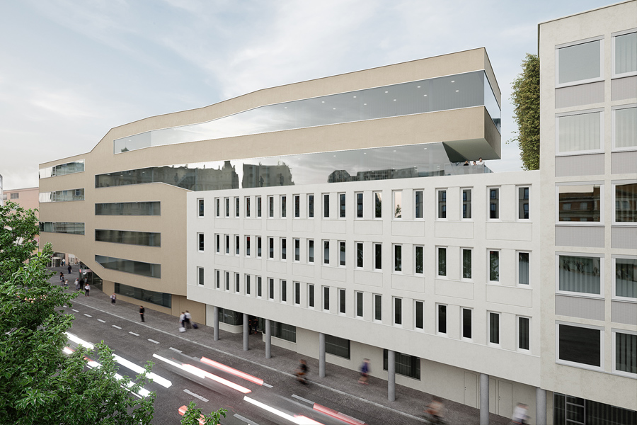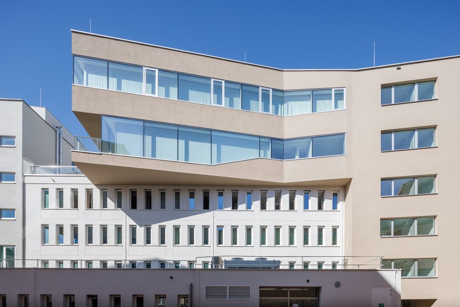 Der Neubau übernimmt die Geschosshöhen der Bestandsgebäude und bindet diese durch ein durchgehendes Stiegenhaus an