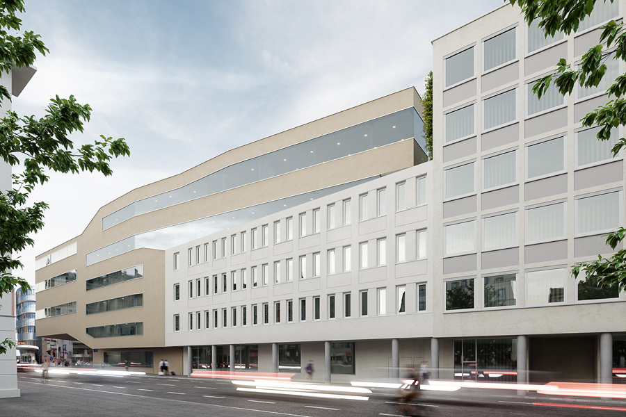 Ab dem 4.OG bildet der Neubau eine übergreifende Spange über einen Teil des Bestandsensembles