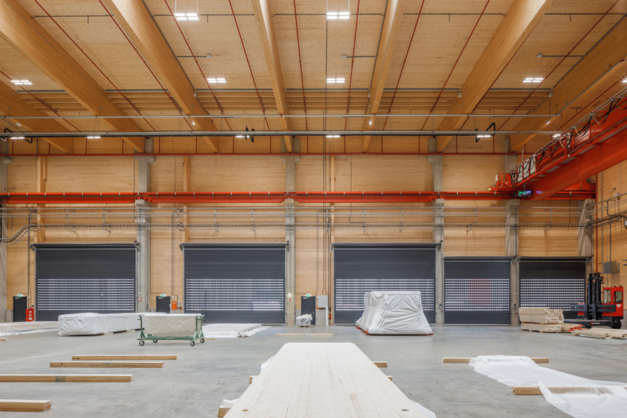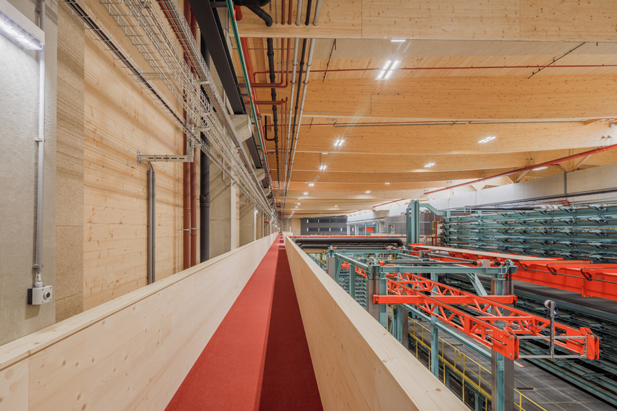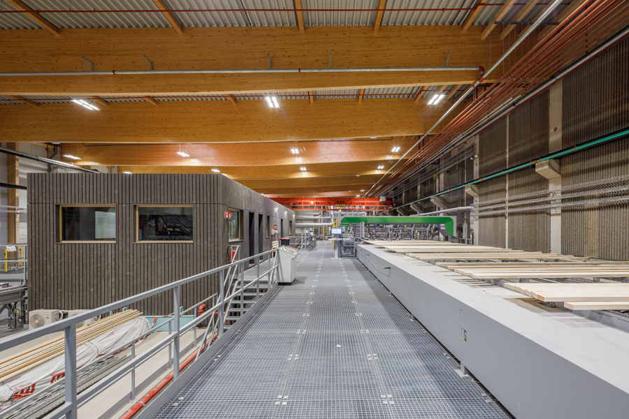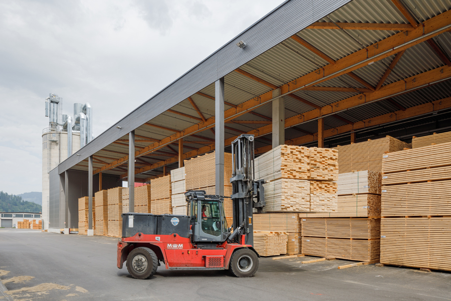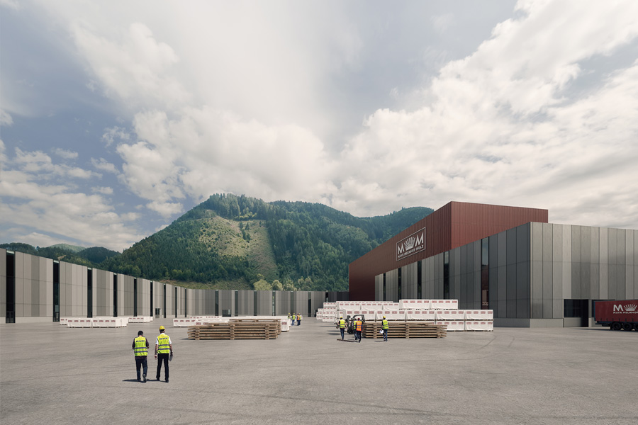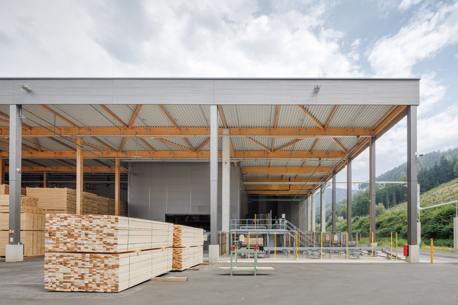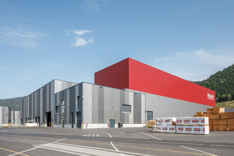 Der Produktionskomplex wurde in Holzbauweise errichtet und nutzt dabei Materialien aus dem eigenen Unternehmen – unter anderem Brettschichtholz, Brettsperrholz und 3-Schicht-Platten. Dies macht den Standort nicht nur zu einem technologischen Leuchtturmprojekt, sondern auch zu einem Beispiel für nachhaltige Industriearchitektur. Auf etwa 33.000m² Produktionsfläche werden Lamellen sortiert, gehobelt, verklebt und zu großformatigen CLT-Elementen weiterverarbeitet. Die geplante Jahreskapazität beträgt bis zu 130.000 m³ Brettsperrholz im Endausbau.