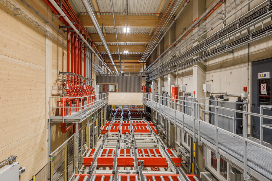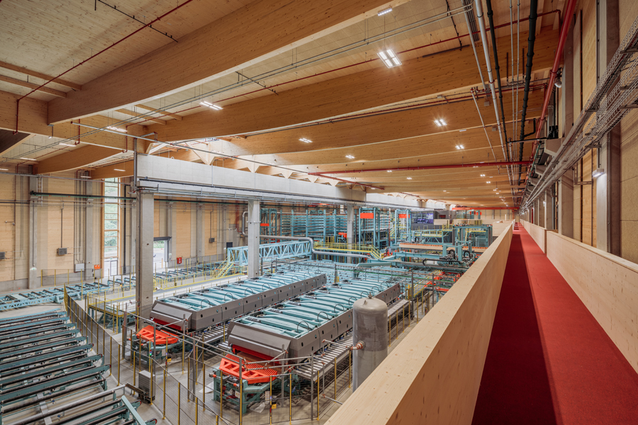 Die Integration eines dreigassigen Hochregallagers mit automatisiertem Materialfluss beeinflusste die gesamte räumliche Organisation.