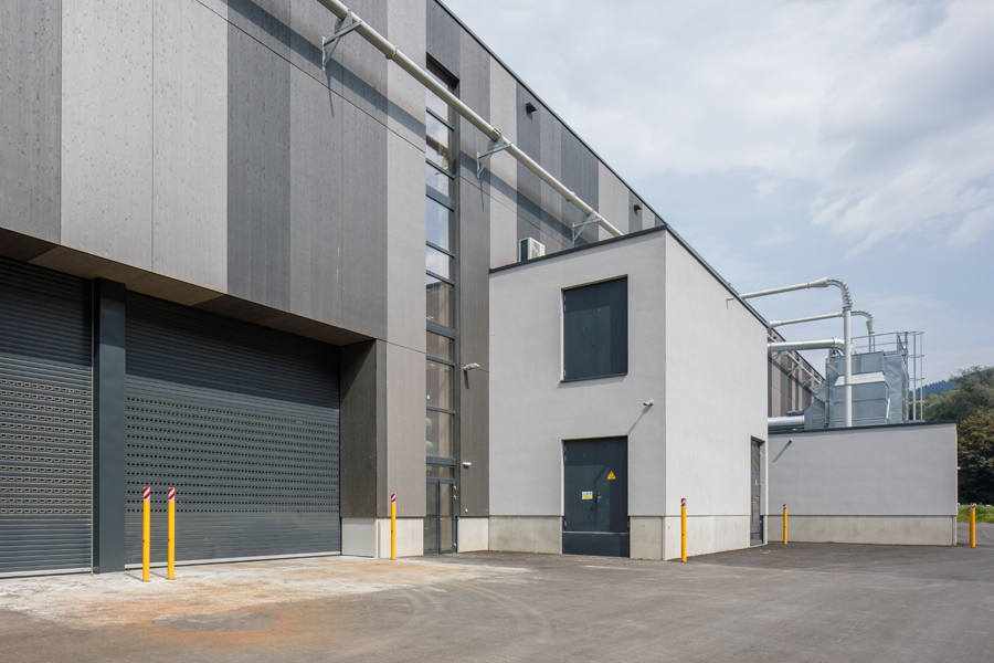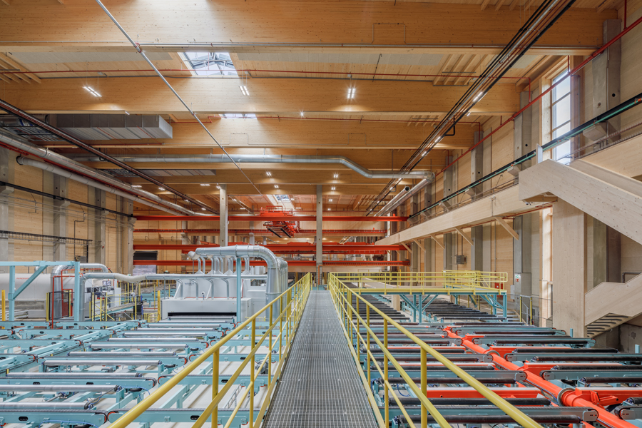 Trotz industrieller Funktion wurde großer Wert auf eine klare, hochwertige Formensprache gelegt – der rote Turm fungiert als Landmarke und verweist auf den innovativen Holzbau.