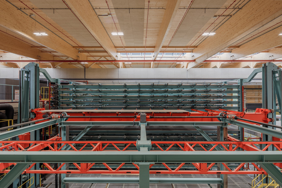 Ein besonderes Merkmal des Standorts ist das dreigassige, vollautomatische Hochregallager mit Platz für rund 28.000 m³ Rohlamellen. Die Intralogistik ist digital gesteuert und auf eine effiziente Versorgung der Produktion und der Lkw-Logistik ausgelegt. Ergänzt wird dies durch eine moderne Absaug- und Filtertechnik sowie eine nachhaltige Energieversorgung, die unter anderem durch Photovoltaikanlagen auf den Hallendächern und die Nutzung vorhandener Wasserkraft abgedeckt wird.