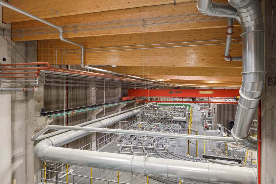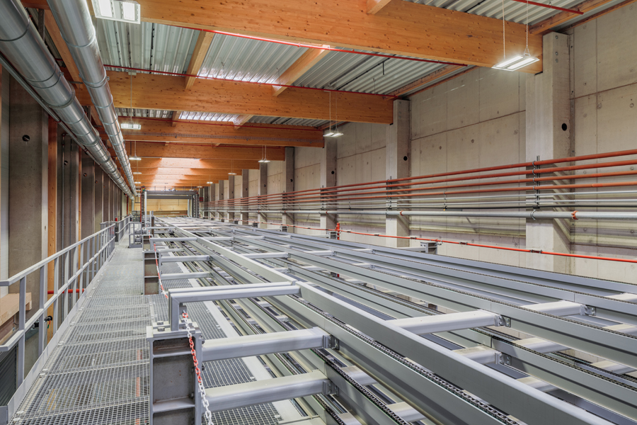 Die Kombination aus großflächigen Holztragwerken und industriellen Nutzungen erforderte detaillierte brandschutztechnische Konzepte und Nachweise.